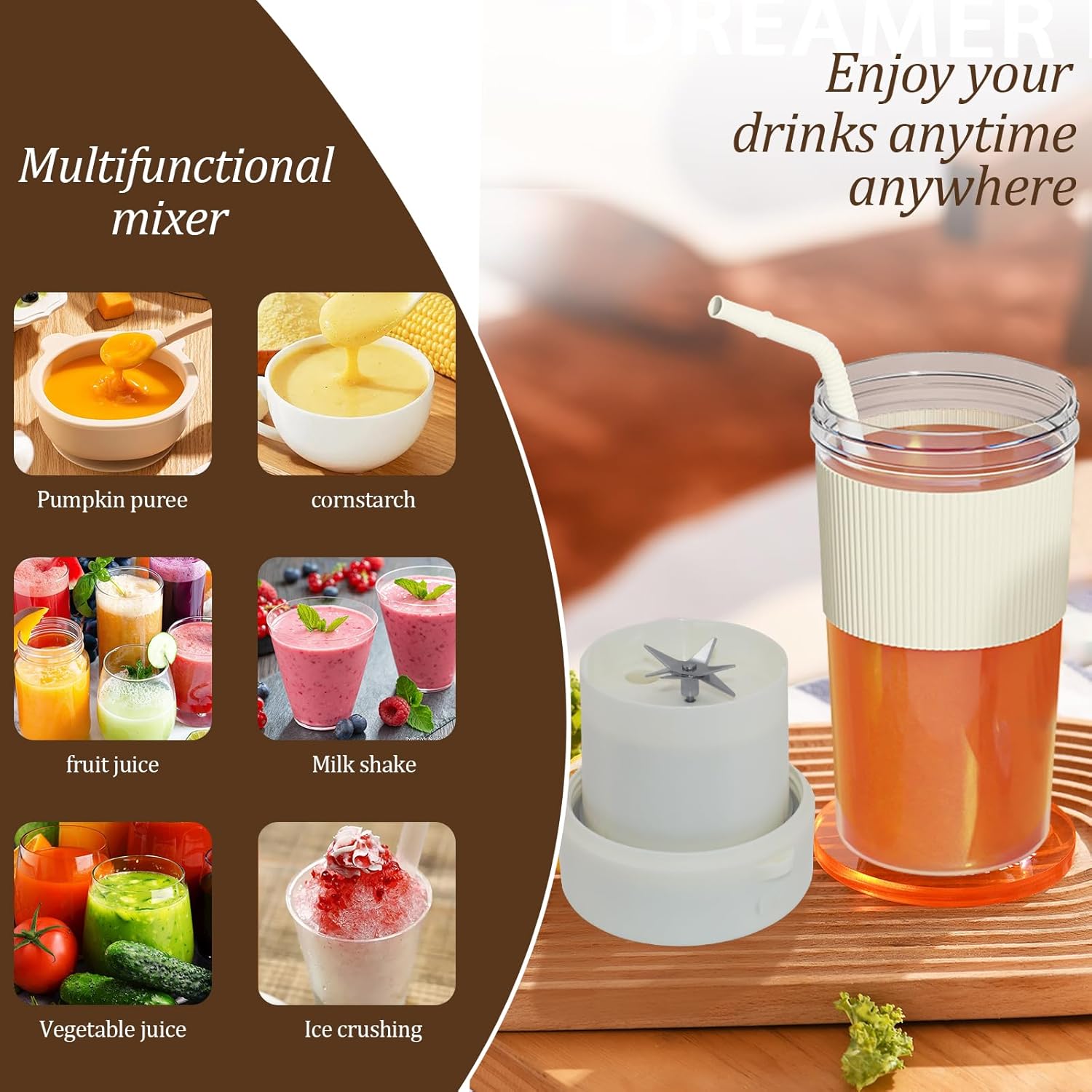 • šŸ¹ć€HEALTHY BLENDING ANYTIME, ANYWHERE怑Our portable blender cup is the perfect solution for those who want to enjoy a healthy drink wherever they are. Portable blender cup is compact, lightweight and portable, perfect for home, office, travel, small dorms and apartments.